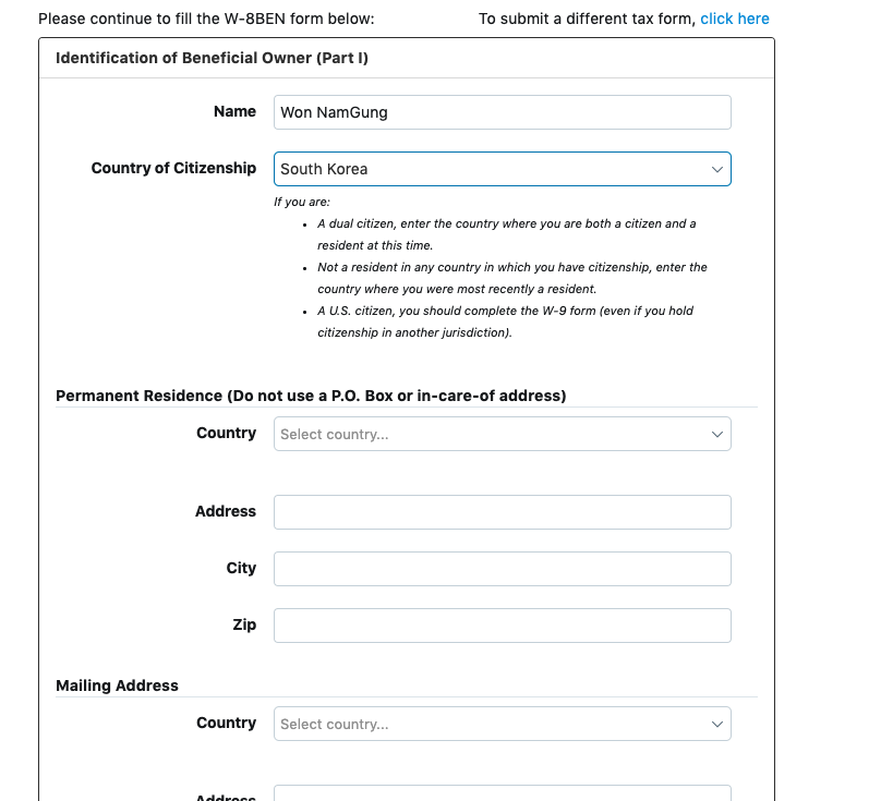 외국 광고 플랫폼이기 때문에 별도 세금계산서를 작성해야합니다. 저는 W-8BEN을 선택했습니다. 자세한 설명은 링크를 참고해주세요