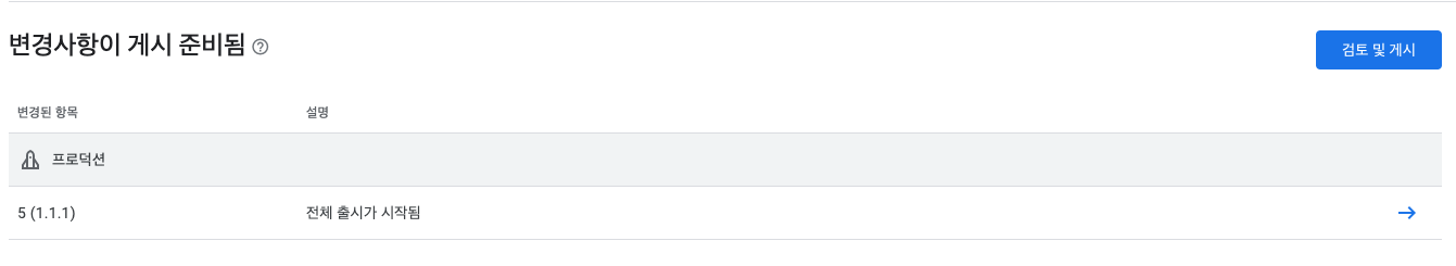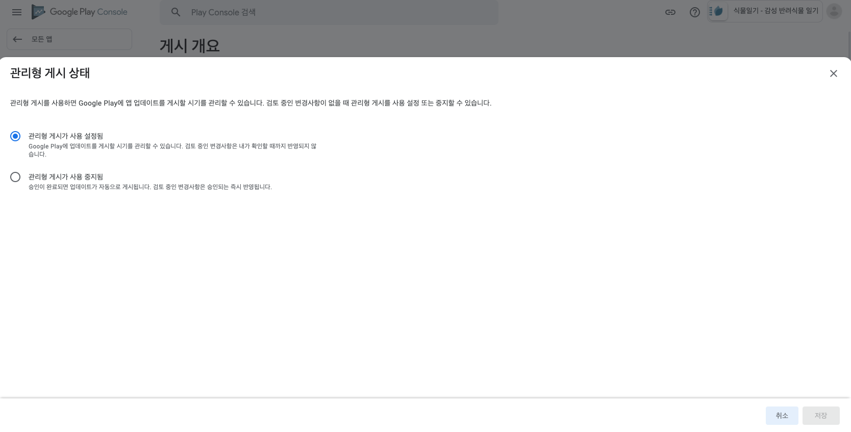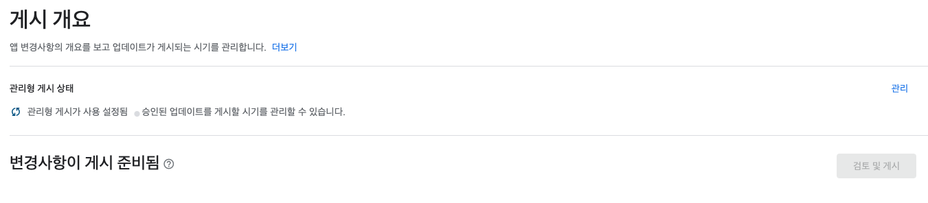 만약 앱 업데이트 권고 푸시를 발송한다면 출시시점을 정확하게 알아야 합니다. 그럴때 구글 콘솔에서 제공하는 '게시개요' 기능을 이용하면 원하는 시점에 앱을 배포할 수 있습니다.