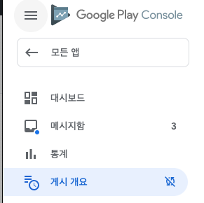 개발자 콘솔에서 앱을 선택하여 대시보드로 진입하면 좌측 메뉴에 '개시개요' 를 찾을 수 있습니다.