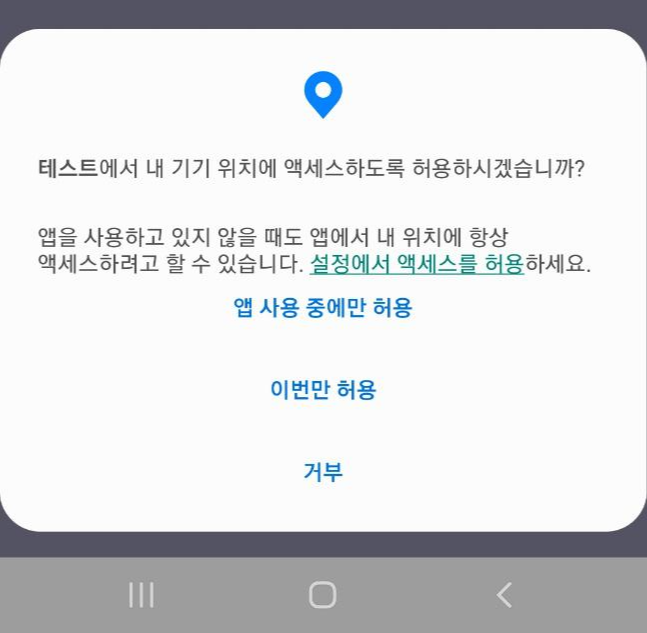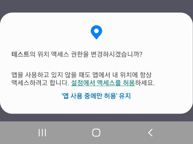 구글에서는 사용자가 백그라운드 위치 권한이 필요한 기능을 이용할때 권한에 대한 설명 팝업(dialog등)을 띄우고 수락을 했을 경우 그림3과 같은 권한 상세 화면으로 이동하길 권고하고 있습니다. 그리고 위치권한이 이미 허용되어 있는 상태에서 'ACCESS_BACKGROUND_LOCATION' 권한을 요청하면 그림4와 같은 팝업이 노출됩니다.