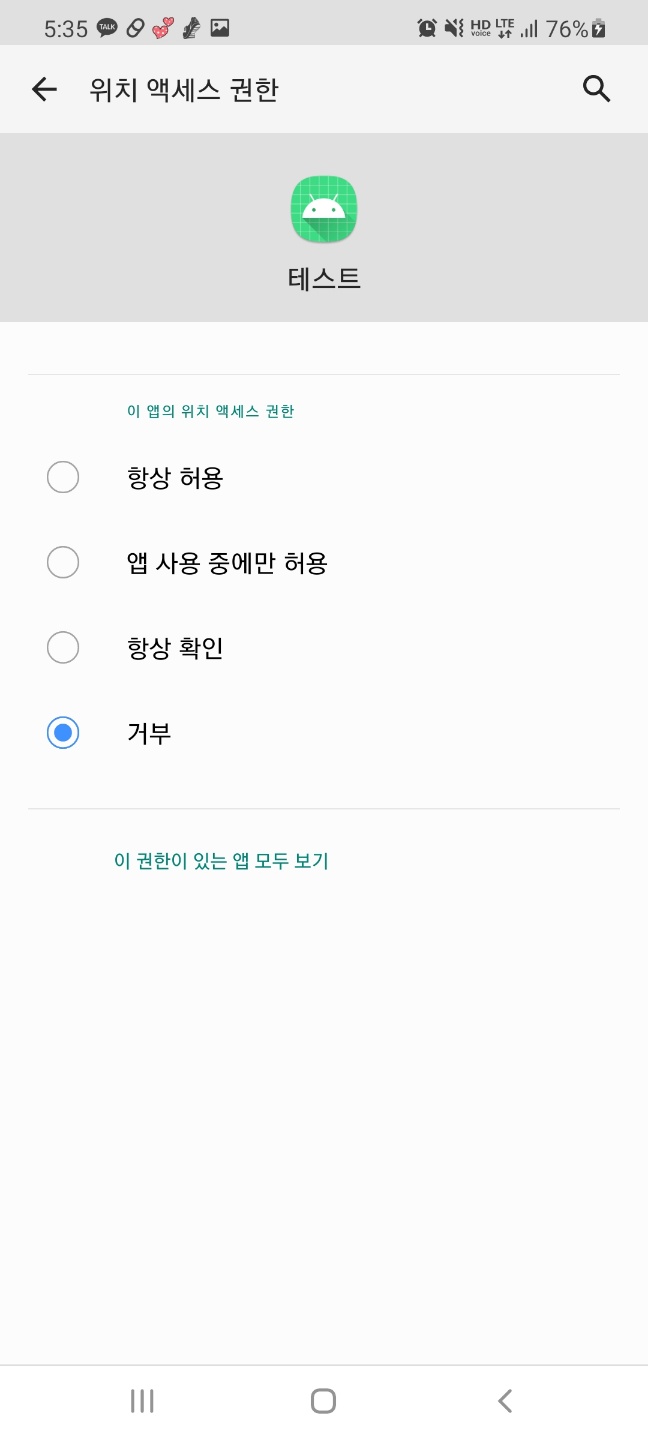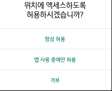 29버전부터 권한 요청시 '앱 사용 중에만 허용' 옵션이 추가돼 앱을 사용중일때만 정보를 얻을 수 있도록 변경 됐습니다.