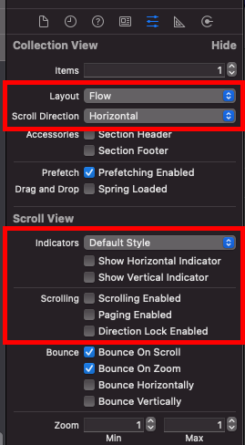 - Paging Enabled : 하나의 아이템이 넘어가면 스크롤을 멈추도록 하는 페이징 기능을 활성화 하는데, Scrolling Enabled와 함께 사용할 경우 페이징 기능이 활성화 됩니다. ( 저는 유저 액션이 아닌 코드로 5초간 넘길거라서 비활성화 합니다. )