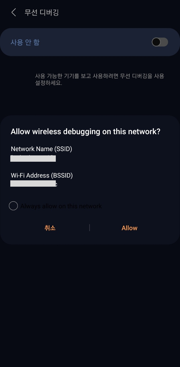 개발자 옵션에서 무선 디버깅 옵션 설정 전 와이파이를 연결해야 합니다.