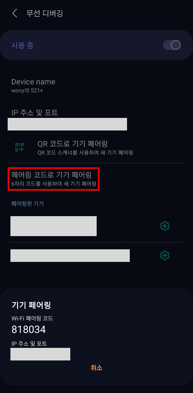 그리고 난 후 '페어링 코드로 기기 페어링' 을 클릭하면 페어링 코드 6자리와 ip주소 및 포트가 팝업으로 아래 사진처럼 뜹니다.