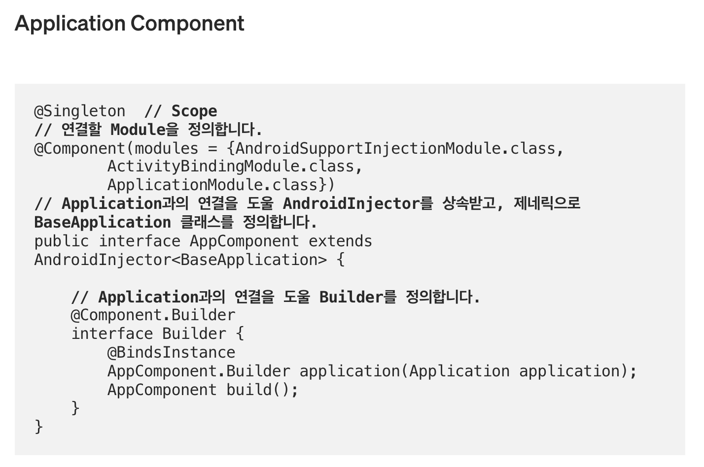 안드로이드에서 Dagger2를 사용하려면 ApplicationComponent와 ActivityCoponent를 개별적으로 생성하고 각 코드 컴포넌트마다 연결을 도울 Builder를 정의하는 보일러 플레이트 코드를 아래 사진 처럼 작성해야 하는 불편함이 있습니다.