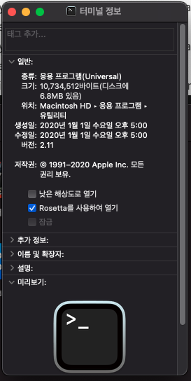 finder > 응용프로그램 > 유틸리티 > 터미널 우측 정보가져오기 클릭 > 'Rosetta를 사용하여 열기 체크'