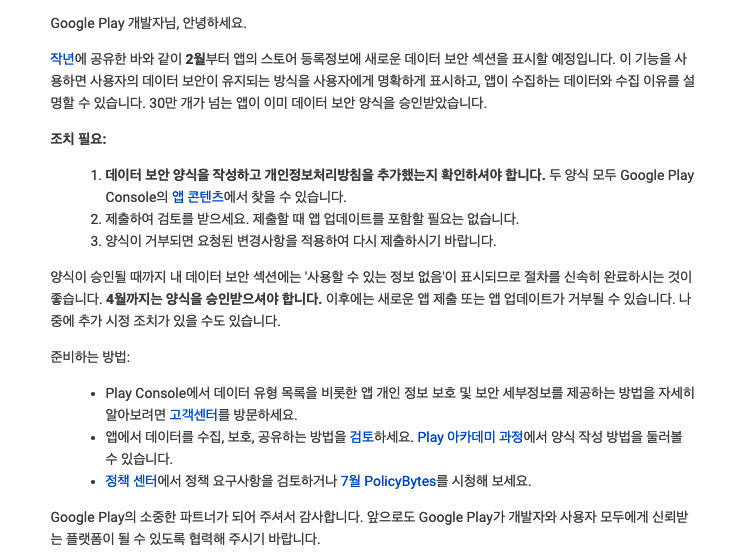 요 근래 '데이터 보안 양식 제출 하세요'란 메일을 구글로부터 받았습니다. ( 아래 사진 참조 )