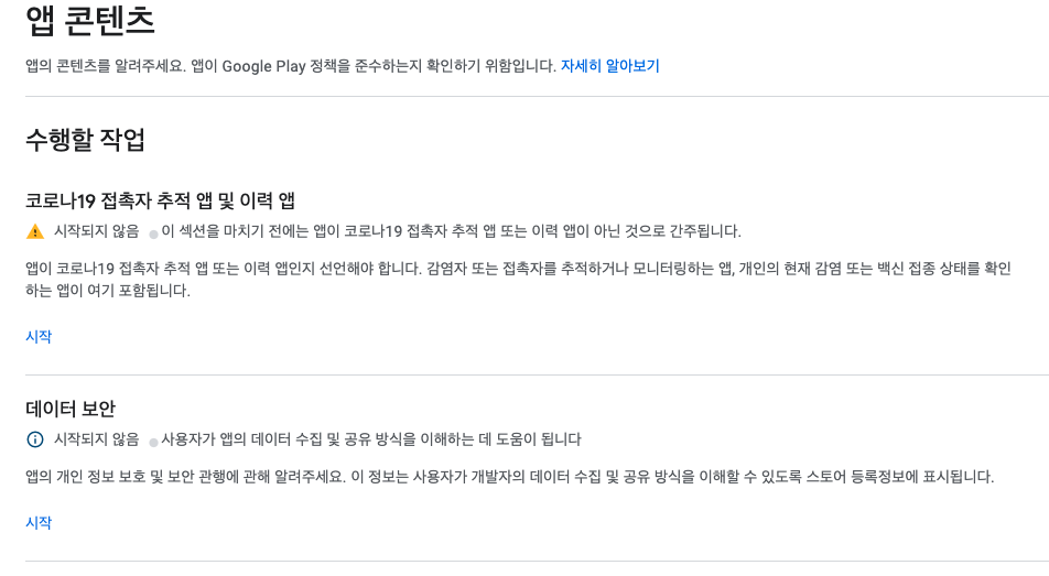 google play console > 앱 선택 > 좌측 메뉴 정책내 '앱 콘텐츠' 클릭하면 아래 사진에 있는 '데이터 보안' 섹션을 시작합니다.