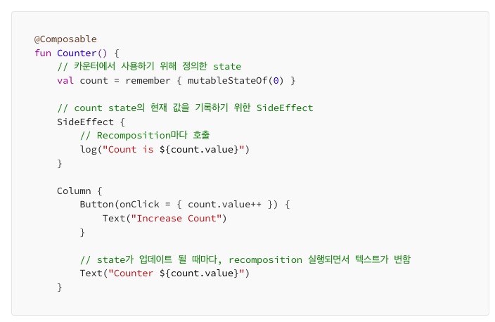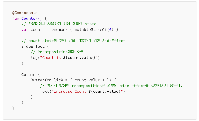 하지만 안쪽에서 바깥쪽 state를 변경해야 하거나, Coposable이 아닌 곳의 state를 변경해야 하는 경우가 생기는데 이를 SideEffect라 칭하며 이로인해 발생할 수 있는 예외 상황을 컨트롤 하고자 SideEffect Api를 제공합니다.