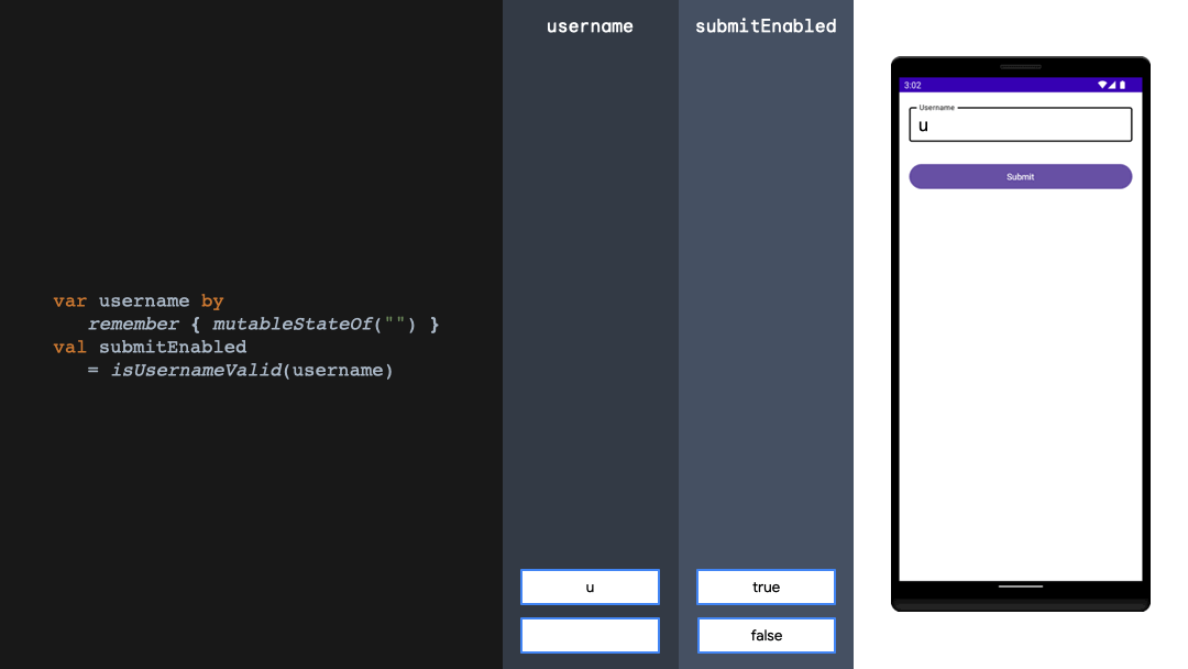 derivedStateOf 키워드와 함께 사용 했을 경우 'submitEnabled' 값이 변경될때만 갱신되는걸 볼수 있습니다.