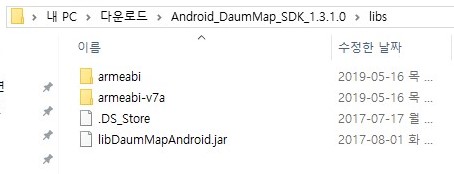 sdk를 다운받아 왼쪽의 파일중 'libDaumMapAndroid.jar' 파일은 app폴더에 'libs'폴더를 생성 후 붙여넣어 주시고 armeabi 와 armeabi-v7a 두 폴더는 app>src>main폴더에 jniLibs폴더를 생성 후 붙여 넣어주시면 됩니다.