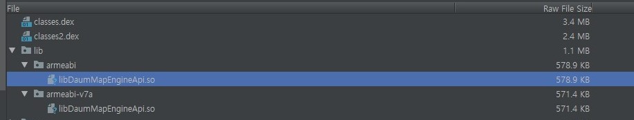 lib 폴더 안에 arm64-v8a or x86_64 폴더가 없다면 추가해서 업데이트해야 합니다. 아래 사진은 카카오 지도를 사용 중인 앱을 분석했을 때 결과로 현재 카카오 지도는 64비트를 지원하지 않습니다.