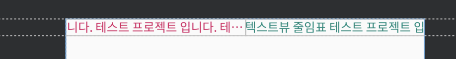 첫번째 텍스트뷰의 말줄임은 정상적으로 작동하지만 영역이 뷰 밖으로 벗어나 있습니다. 영역이 벗어나지 않도록 하려면 넓이를 0dp로 바꾸면 되지만 그렇게 하면 글의 길이 짧아지면 각 텍스트뷰가 전체뷰를 반씩 나눠갖은 상태이기 때문에 원하는 그림처럼 나오지 않습니다.